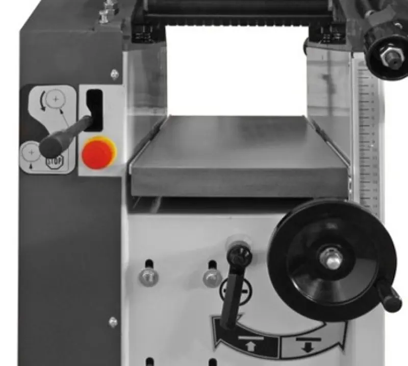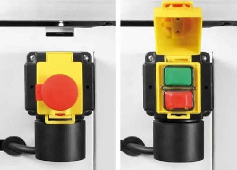 Srovnávací a tloušťkovací frézka je vybavena elektromagnetickým vypínačem s protiprachovou úpravou i funkcí STOP tlačítko a dalšími prvky, zajišťující maximální bezpečnost a komfort obsluhy. Připojení srovnávací a tloušťkovací frézky k síti se provádí pomocí 16 A 5-pólové vidlice k zásuvce umístěné na stroji, sled fází a tím i správný směr otáčení lze změnit pouhým přetočením 2 pólů v zásuvce pomocí plochého šroubováku.