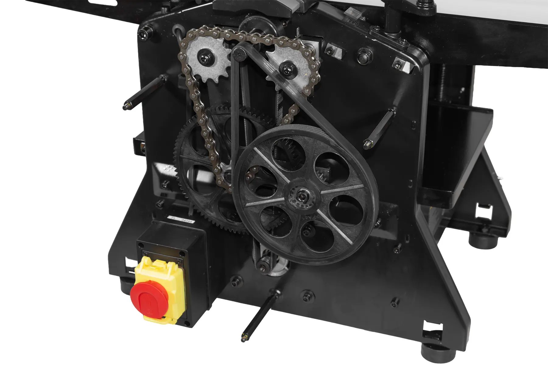 Přenos výkonu je řešen kombinací řemenového a řetězového převodu, který zajišťuje spolehlivý chod motoru stroje a synchronizovaný posuv materiálu při protahování.