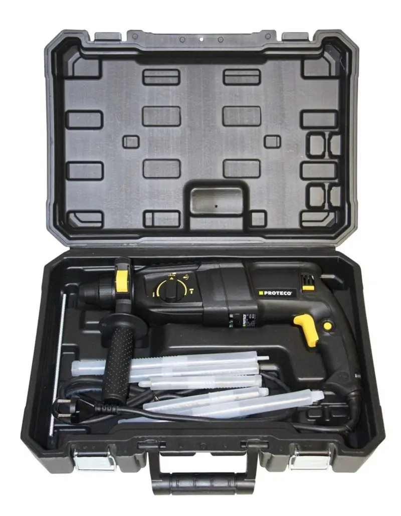 Kladivo vrtací Proteco je spolehlivý pomocník každého kutila určený k vrtání a sekání do betonu, kamene či cihel. Stačí jen použít příslušný vrták nebo sekáč, jejichž výměna je velmi jednoduchá a rychlá díky použitému mechanismu SDS+. K pohodlnému uchycení nástroje do ruky poslouží hlavní a přídavná rukojeť.