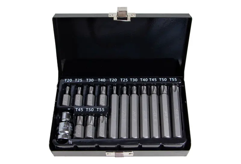 Sada bitů Torx 15 dílů je užitečným pomocníkem pro povolování, nebo utahování šroubů s vnitřním tvarem hlavy TRX, tzv. torx, neboli hvězdička. Umožňuje ale šroubovat i vruty do dřeva, kovu, plastu, či jiných stavebních materiálů. Díky své všestrannosti si nalezla cestu k mnoha našim zákazníkům, ať už kutilům či profesionálům. Bity jsou vyrobeny z chrom-vanadiové oceli a jejich jednotlivé tvary jsou speciálně frézovány tak, aby garantovali maximální výdrž, přesnost a kvalitu při používání. Díky 1/2“ redukci, lze 10 mm bity bezpečně a komfortně umístit do ráčny, nebo vratidla a práci s nimi tak maximálně urychlit.