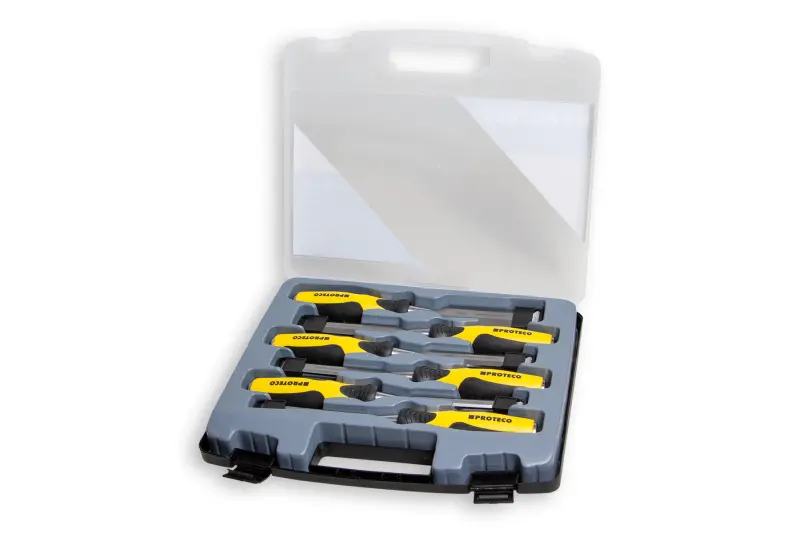 Sada dlát PROTECO vyrobených z kvalitní CrV oceli zaručující vysokou a přesnou kvalitu zpracování. Sada obsahuje 6 ks dlát (8, 10, 14, 18, 22, 32 mm). Mekčená rukojeť zajišťuje pohodlnou a dlouhotrvající práci s pevným úchopem. Čepele jsou přesně broušené pro maximální ostrost. Dláta disponují poniklovanou ocelovou údernou plochou, která je pevná a odolná.