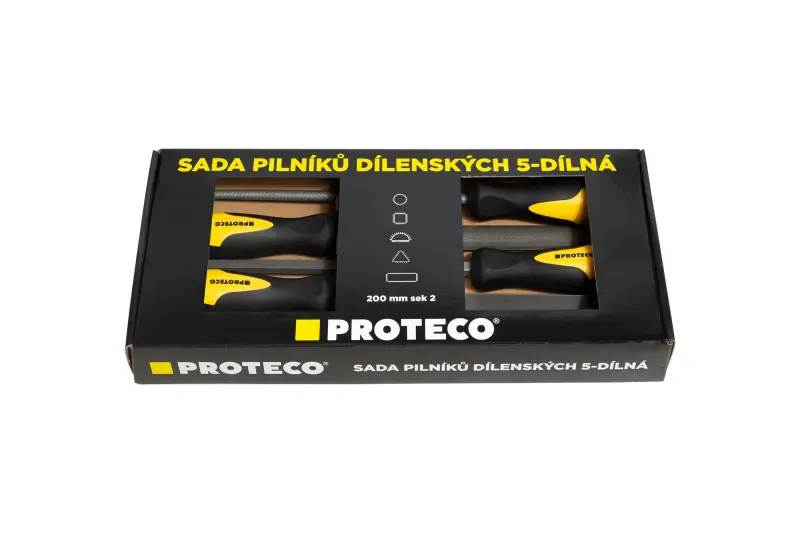 - Sada pilníků 5-dílná obsahuje pilníky sek 2 délky 200 mm: plochý,    úsečový, trojhranný, čtyřhranný, kruhový