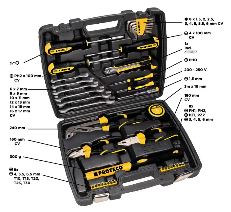 Sada nářadí v kufru 42 dílná je vyrobena z CrV materiálu. Sady obsahuje veškeré běžně využívané nářadí v domácnosti.