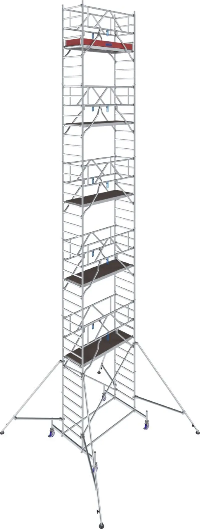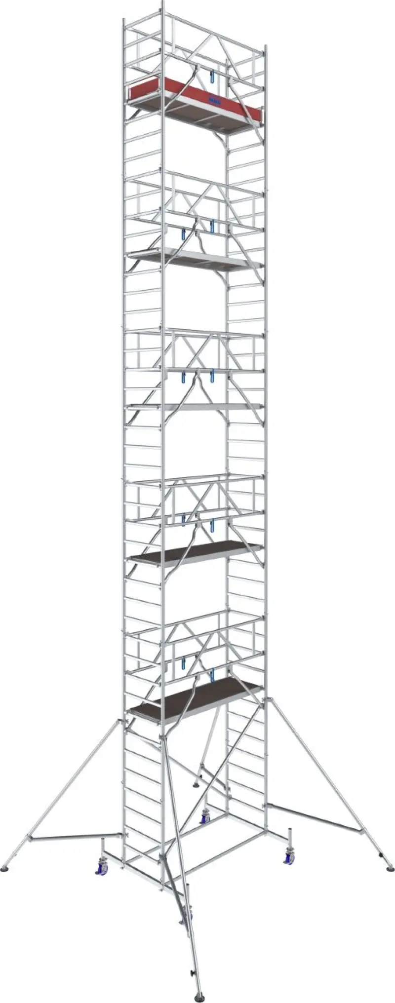 Od výšky 4,40 m jsou součástí ocelové stabilizátory, od 7,40 m pak i teleskopické výložníky s nastavitelnými patkami pro vyšší stabilitu. Kolečka s nastavitelnou výškou (Ø 150 mm) usnadňují přesun i práci na nerovném terénu.