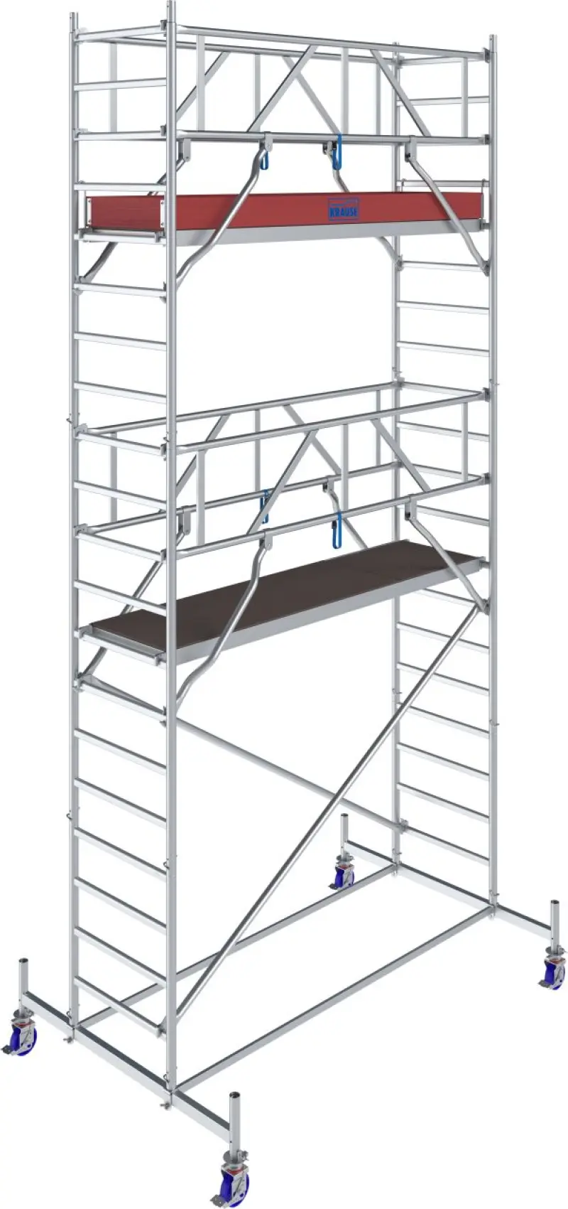 Klíčovým prvkem je GuardMatic-System, který umožňuje bezpečné upevnění zábradlí před montáží další plošiny – uživatel tak má kompletní ochranu proti pádu už při výstupu. Integrované diagonální výztuhy zajišťují stabilitu a rychlou montáž. Lešení je vybaveno samosvorným spojovacím systémem KRAUSE, který urychluje stavbu a demontáž bez použití nářadí.