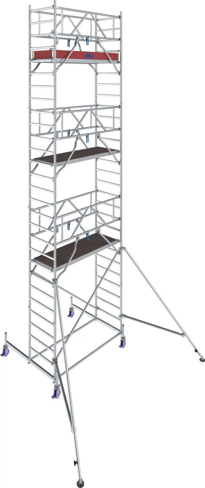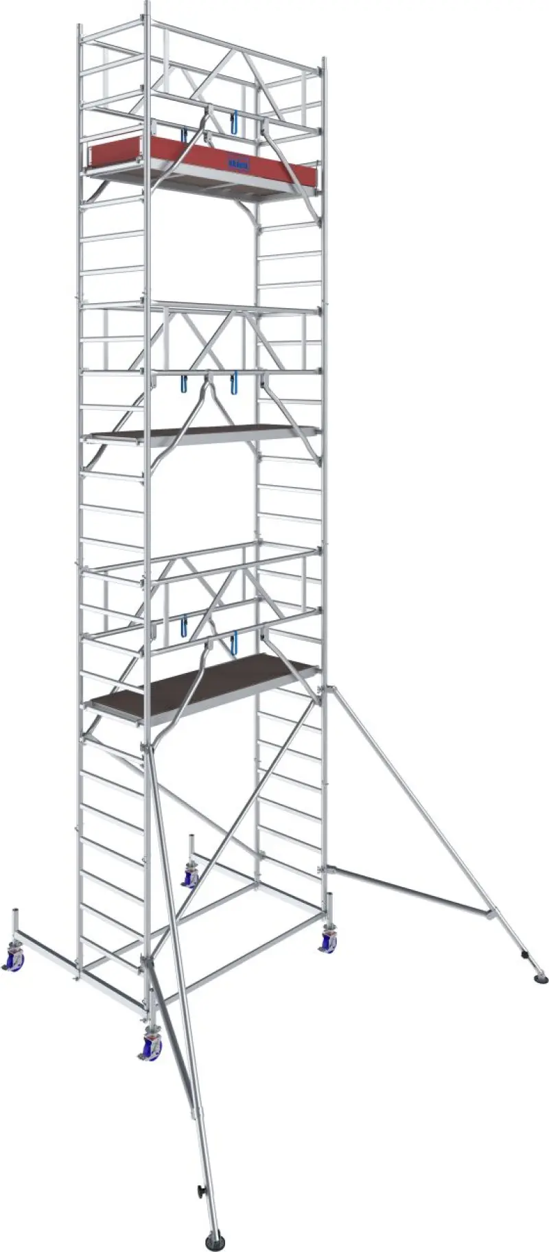 Od výšky 4,40 m jsou součástí ocelové stabilizátory, od 7,40 m pak i teleskopické výložníky s nastavitelnými patkami pro vyšší stabilitu. Kolečka s nastavitelnou výškou (Ø 150 mm) usnadňují přesun i práci na nerovném terénu.