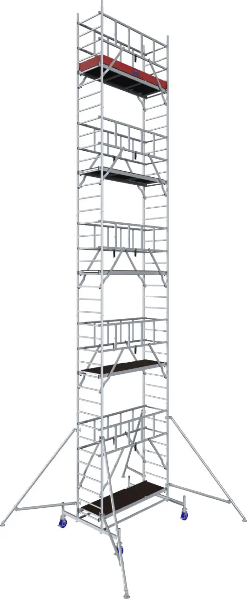 Pevné hliníkové pojízdné lešení Krause s pracovní výškou 11,3 m pro náročné aplikace s výškově nastavitelnými, brzděnými kolečky. Bezpečná montáž lešení je zajištěna díky fixaci kolejnicového rámu GuardMatic-System před sestavením další vyšší plošiny. Při výstupu na další plošinu je tak k dispozici kompletní zábradlí chránící proti pádu. Samotnou bezpečnost při práci ve výšce pak zajišťuje systém šestibodového upevnění. Díky novému systému diagonálních vzpěr lze navíc pohodlně využít celé plochy plošiny, aniž by se vám vzpěry pletly.
