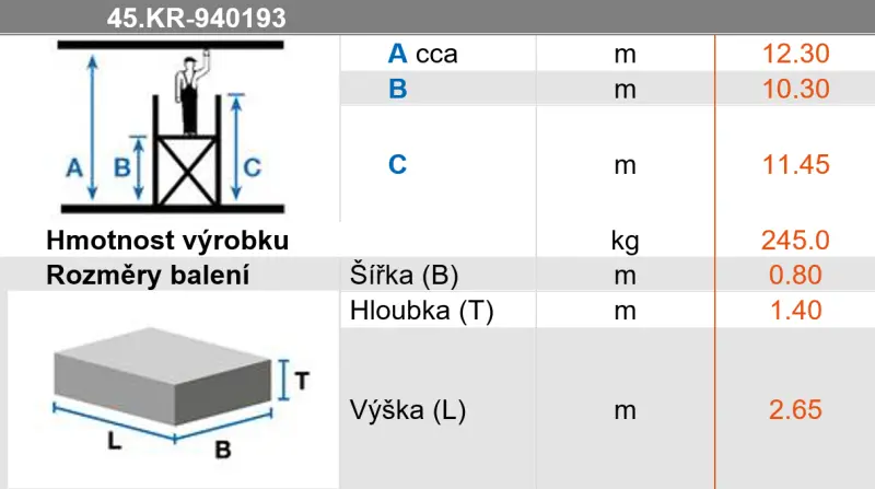 - Výška lešení 11,45 m, pracovní výška 12,3 m