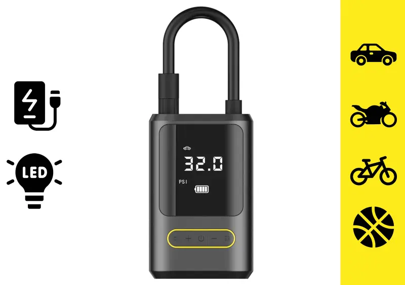 - Součástí sada adaptérů pro nafoukání všeho potřebného (míče, pneumatiky motocyklu, auta, kola, elektrokoloběžky, nafukovací matrace, bazénku atd.)