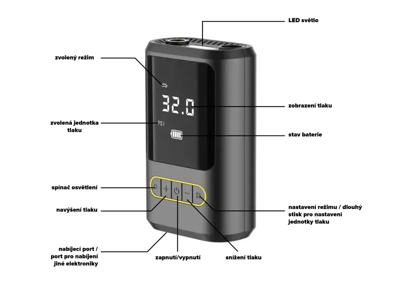 Kromě detekce tlaku v pneumatikách a vzduchového kompresoru nabízí tento šikovný pomocník i další praktické funkce. Přístroj disponuje LED světlem s několika variantami svícení. Bílé světlo lze použít buď jako baterku/lampičku, nebo také v krajní nouzi jako přední světlo na kolo. Režim červeného výstražného světla můžete zase využít jako zadní výstražné světlo na kolo. Přístroj lze také použít jako powerbanku, díky níž si můžete na cestách např. nabít mobilní telefon či jinou drobnou elektroniku.