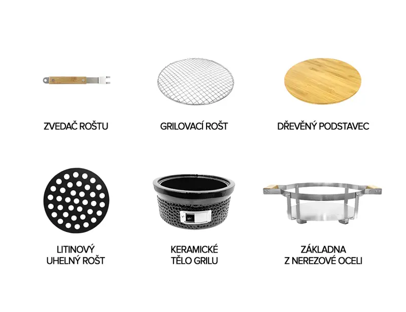 stolní gril na dřevěné uhlí; přenosný; keramický; stojan a pás z nerezové oceli; grilovací rošt (nerezová ocel); tělo grilu odolné do 1000 °C; hmotnost 12 kg; dřevěný podstavec jako DÁREK