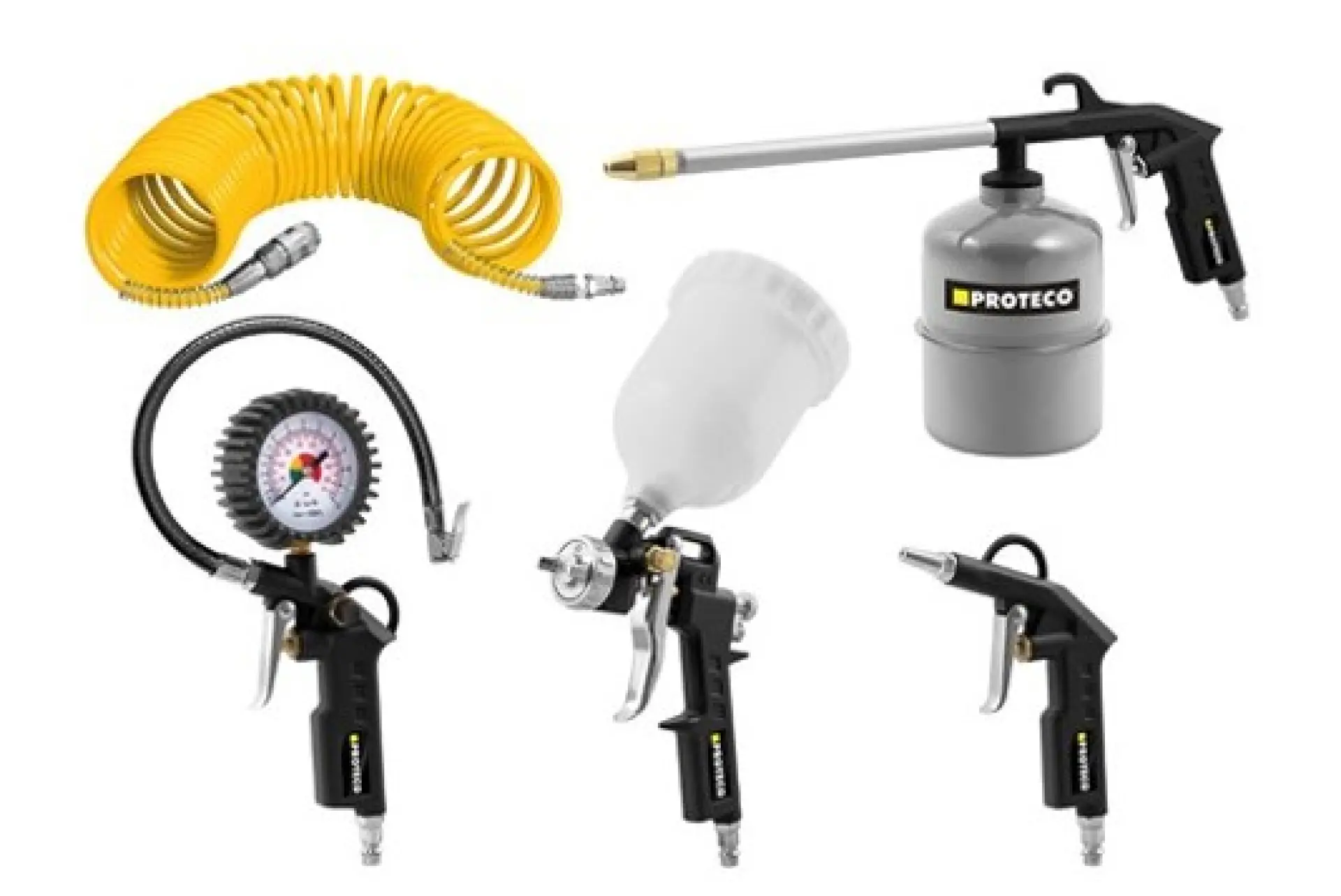 Sada pneumatického nářadí 5 dílná je vhodná svým použitím do každé dílny a ideálním příslušenstvím ke každému kompresoru. Díky své obsáhlosti umožnuje huštění, dofukování, ale hlavně přesné měření pneumatik, míčů či bazénů v hodnotách od 0 do 12 barů. Dále umožňuje ofukování prachu, pilin a nečistot z těžko přístupných míst. Připojení kteréhokoli z nástrojů se provádí velmi jednoduše za pomocí rychlospojky s možností využítí spirálové tlakové hadice o délce 5 metrů.