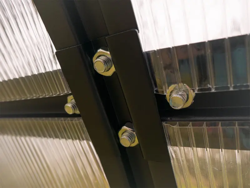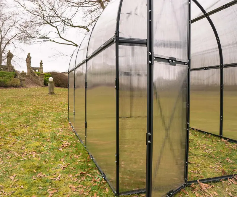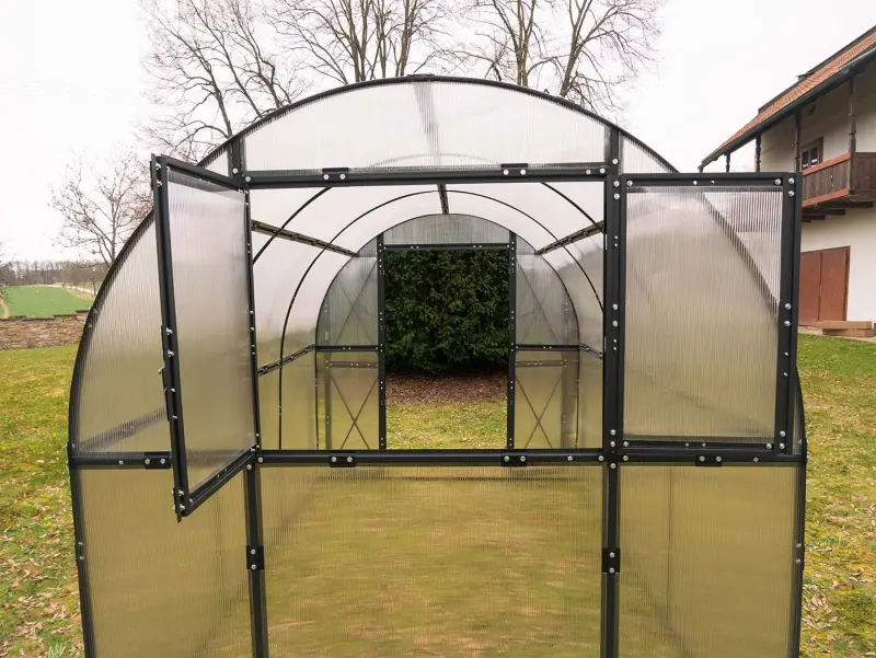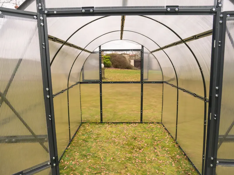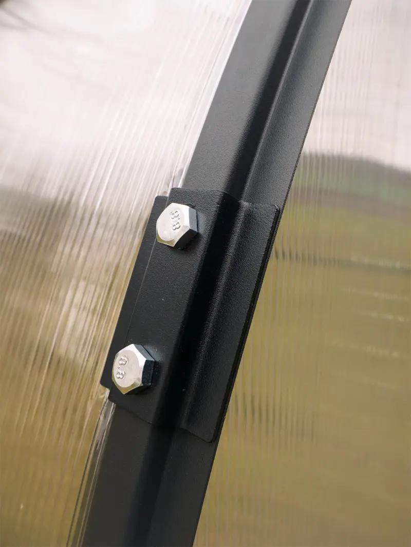 Robustní konstrukce skleníku se skládá z 1 mm tlustých ocelových profilů s galvanickým pokovením a finálním UV ochranným lakem, což zajišťuje maximální odolnost proti vnějším vlivům, včetně deště, větru a slunce, čímž se značně prodlužuje jeho životnost a skleník vám tak poslouží po dlouhé roky. Prosklení je tvořeno ze 4,5 mm polykarbonátu s ochranou proti UV záření. Tyto desky jsou nejen odolné, ale také přispívají ke zlepšení přirozeného osvětlení uvnitř skleníku, což má pozitivní vliv na růst a zdraví pěstovaných rostlin.