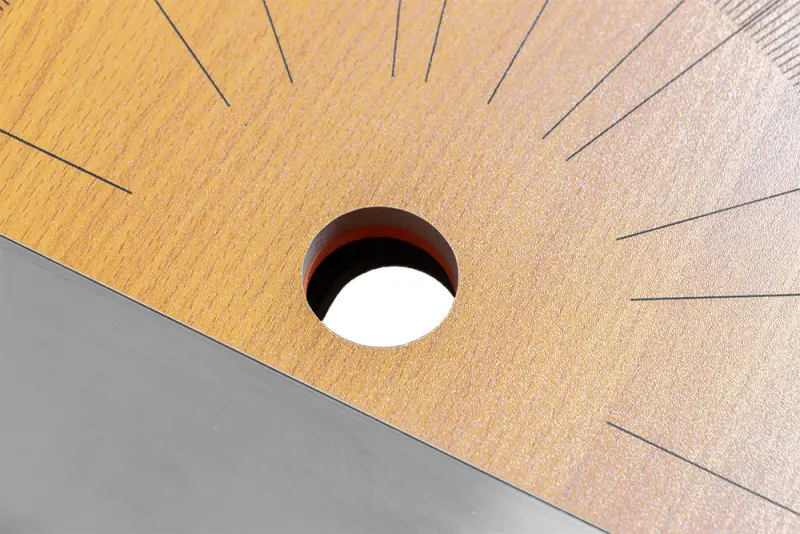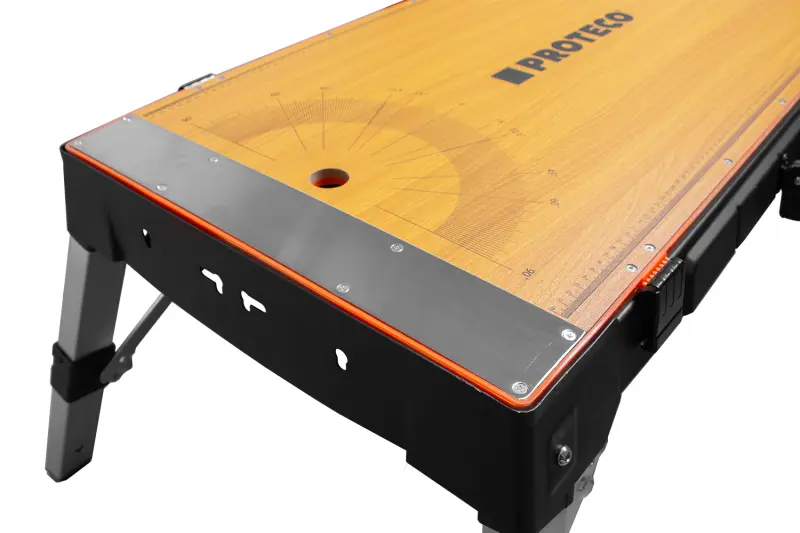 Skládá se ze snadno výměnného oboustranného stolu. Na jedné straně je deska vyrobená z MDF dřeva potřebného pro práci s pracovním stolem, který má také úhloměr, pravítko pro měření a otvor pro děrování otvorů o průměru až 30 mm bez vrtání samotné desky. Druhá strana desky je vyrobená z polypropylenového plastu, což znamená, že se snadno umývá a čistí, tím se stává ideálním pro funkce převozu nebo vysuté plošiny. Díky kombinované konstrukci poskytuje uživateli lehkost a zároveň robustnost. Struktura sklápěcích nohou umožňuje snadné vysouvání. Stůl je vybaven vystuží z nerezové oceli k práci a zamezení poškození pracovní desky.