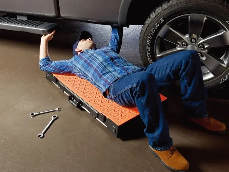 Díky zasunovacím nohám a čtyřem pojezdovým kolečkům lze pracovní stůl snadno předělat na pojizdné lehátko. Dvě kolečka jsou otočná o 360°. Díky tomu lze pracovat na špatně přístupných místech např. pod autem nebo jinými nízko umístěnými vozidly, to usnadní údržbu a opravy na podvozku. Lehátko tak umožňuje pracovat na různých projektech, přičemž zaručuje maximální mobilitu a flexibilitu pro vaše potřeby.