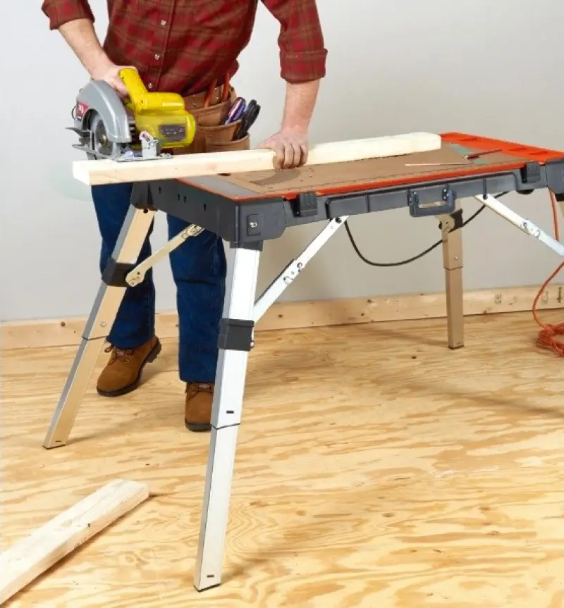Na pracovním stolu v optimální výšce budete s dostatkem komfortu a bezpečí vrtat, řezat, brousit atd. Otočná pracovní deska s madlem, dřevěnou vlákninou uvnitř a protiskluzovým povrchem je osazená kovovým rámem odolným proti prořezu i zatloukání hřebíků. Deska je vybavena měřidly, otvorem pro vrtání a praktickou karabinou pro uchycení kabelu nebo lanka.