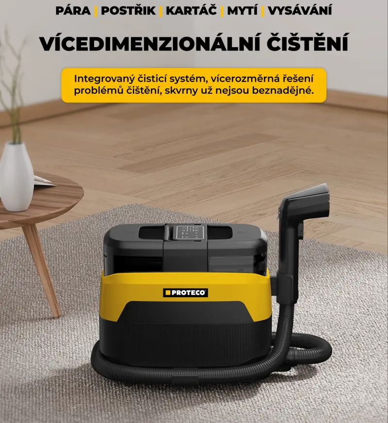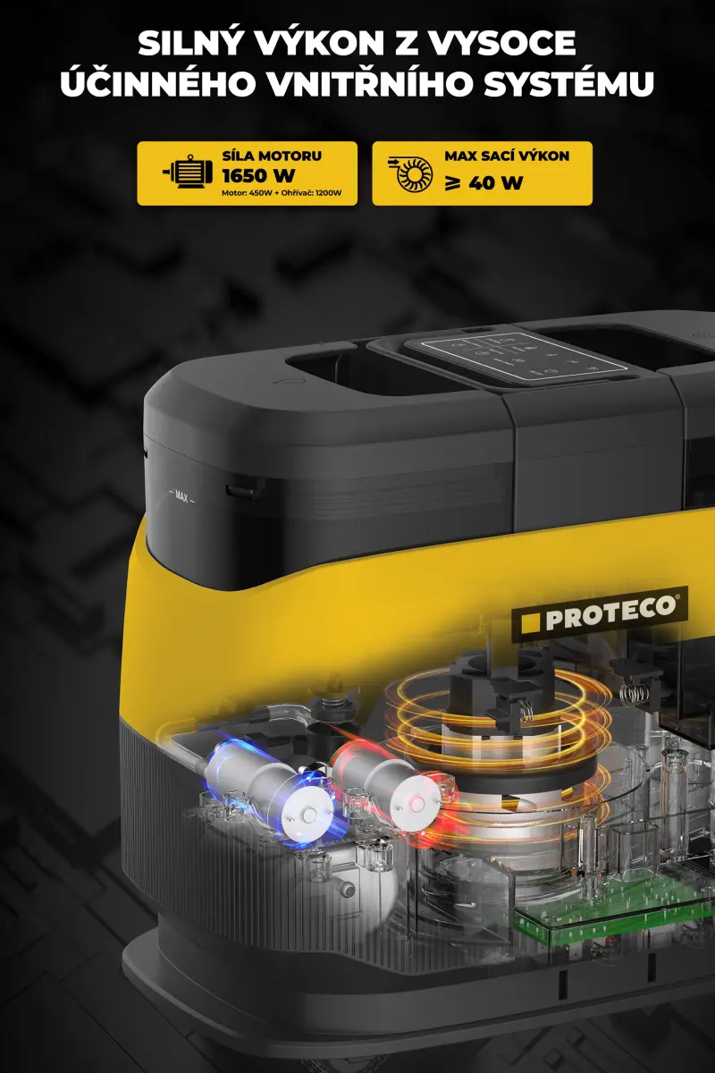 Tepovač a parní čistič PROTECO PREMIUM je neocenitelným kompaktním pomocníkem do domácnosti. Výkon 1650 W společně se sacím podtlakem 12 kPa zajišťuje účinné odstranění nečistot, rychlý ohřev a dostatek páry pro hloubkový úklid v celé domácnosti. Velké nádržky na vodu - 1250 ml pro čistou a 1150 ml pro špinavou vodu - umožňují delší práci bez častého vyprazdňování či doplňování. Do nádržky lze navíc přidat nízkopěnivý čistící prostředek, který zvýší účinnost tepování a zanechá povrch svěží a hygienicky čistý.