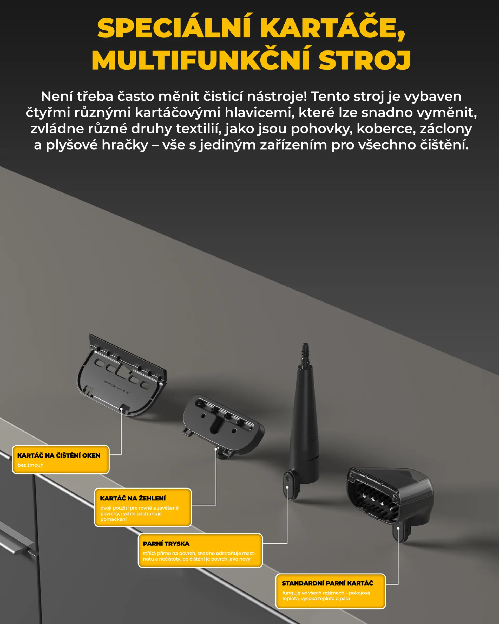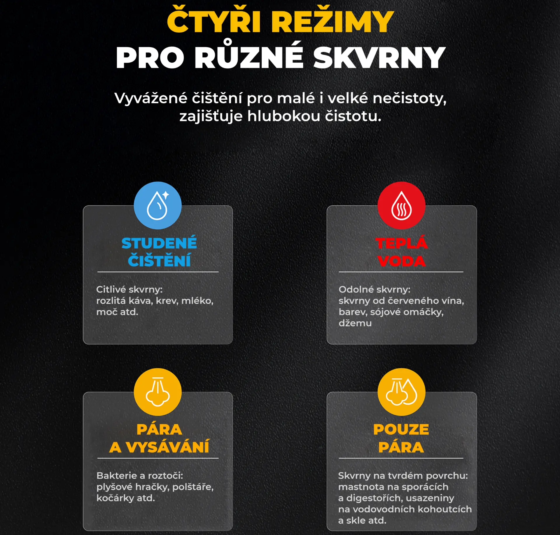4 režimy - vysávání se studenou vodou, vysávání s teplou vodou, pára s vysáváním, pára bez vysávání