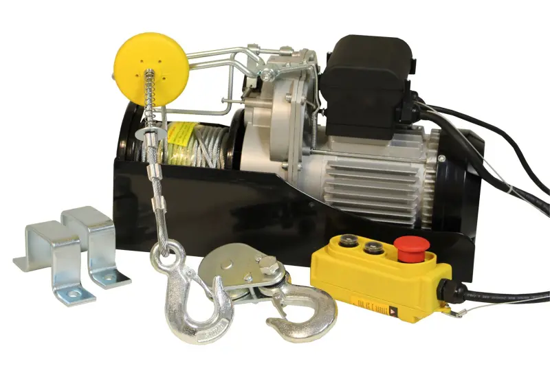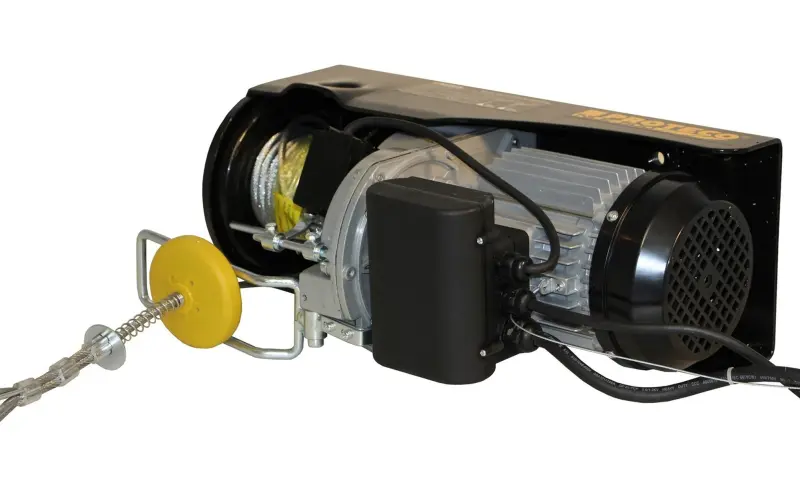 Elektrický lanový naviják (nebo také elektrický vrátek) Proteco 999/500 kg je vhodný ke svislému zdvihání a spouštění břemen s kladkou nebo bez. Pokud použijete kladku, lze zdvihat břemena o maximální hmotnosti 999 kg do výšky 6 m. Režim bez kladky je určen pro předměty do 500 kg, které zvednete do výšky 12 m. Pohon navijáku zajišťuje asynchronní motor o příkonu 1 300 W, který je vybaven vratnou tepelnou ochranou. Ta zabezpečí v případě přehřátí motoru jeho odpojení. Po vychladnutí motoru je jeho funkce opět obnovena. Motor je vybaven elektromechanickou brzdou, která při vypnutí el. proudu ihned zajistí manipulované břemeno v aktuální pozici. Převod je složen z ocelových kalených kol se stálou tukovou náplní v hliníkové skříni. Hřídele jsou uloženy v kuličkových ložiscích. K ovládání navijáku slouží ovladač, který je vybaven kolébkovým přepínačem – zvedání a spouštění břemena a bezpečnostním STOP tlačítkem. Pro snížení zatížení přívodního kabelu je ovladač zavěšen na ocelovém lanku.