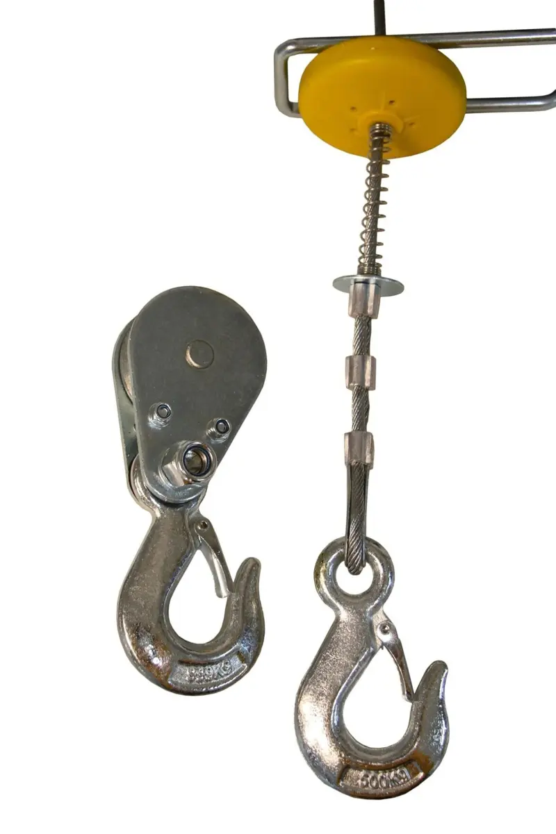 - Součástí je montážní sada pro zavěšení (spony, šrouby) a kladka