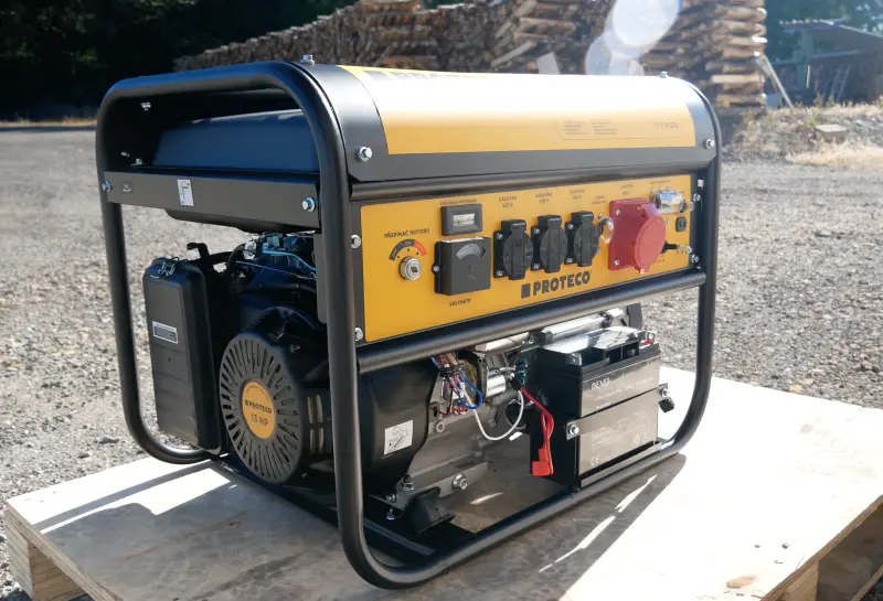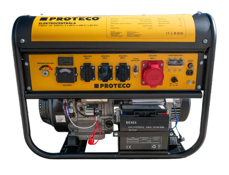 Benzínová elektrocentrála PROTECO s maximálním výkonem 5500 W poskytuje stabilní zdroj elektrické energie jak v domácnosti, tak při náročnějších pracích tam, kde není zavedená elektrická síť (stavby, festivaly, kempy). Disponuje 400 V zásuvkou pro větší třífázové stroje, třemi standardními jednofázovými 230 V zásuvkami pro běžnou elektroniku a jednou 12 V zásuvkou pro menší elektroniku (autoelektroniku). Tento generátor rovněž disponuje funkcí elektrické regulace výstupního napětí AVR, díky čemuž lze bez starostí k elektrocentrále zapojit jemné elektronické přístroje (např. TV přijímače, počítače atd.). Součástí je akumulátor 12V/17 Ah .