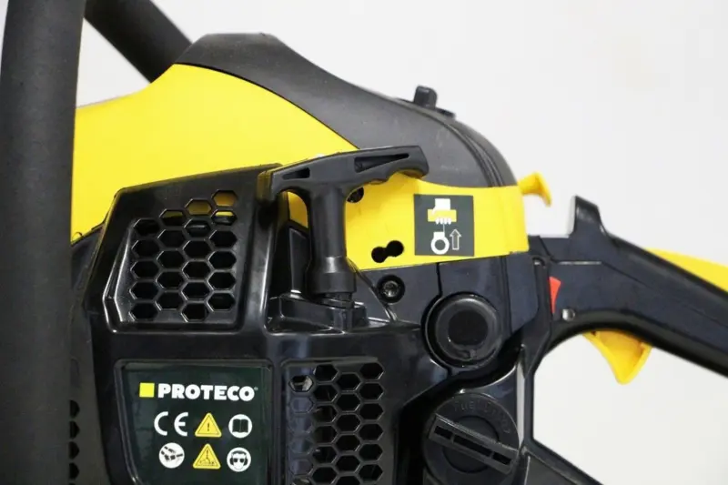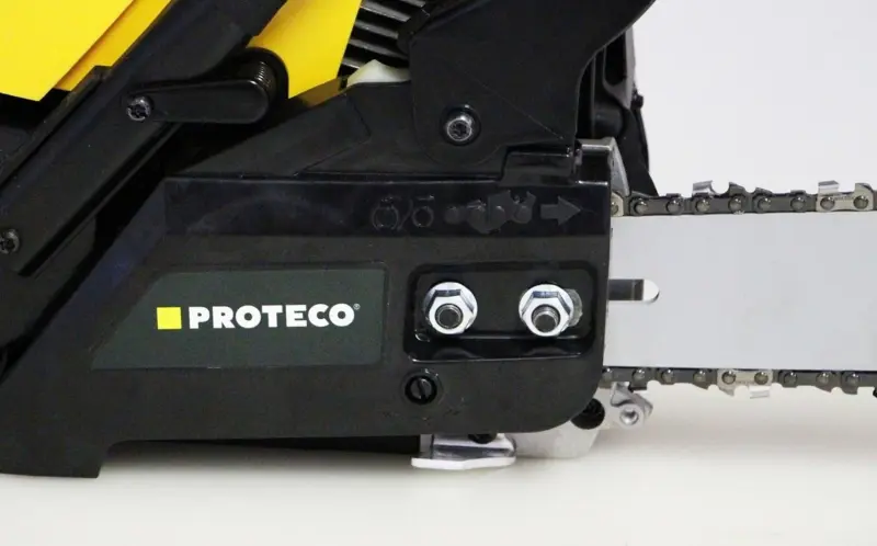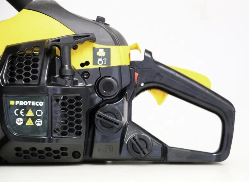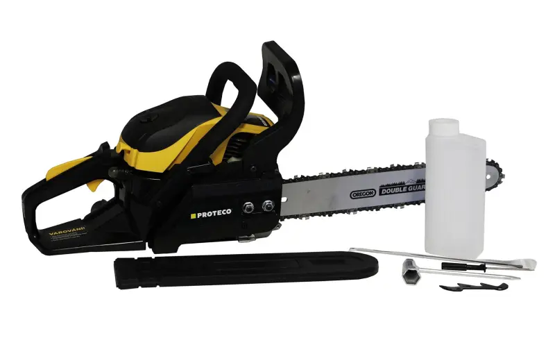 Řetězová pila benzínová Proteco je ideální pomocník pro řezání dřeva malých a středních průměrů, odvětvování, prořezávání, řezání palivového dříví apod. Zdařilá kombinace vysokootáčkového dvoutaktního motoru o zdvihovém objemu 37.2 cm³ a výkonu 1,2 kW činí z motorové pily velmi oblíbeného komfortního a kompaktního pomocníka pro každého vášnivého kutila, či zahrádkáře. Motorová pila disponuje 35 cm lištou a řetězem Oregon pro plnění i těch náročnějších úkolů. Motor je sestavou silentbloků a plastových krytů nejen chráněn proti nárazu, ale i spolu s odstředivou spojkou maximální možnou měrou zbaven vibrací a hlučnosti. Optimální napnutí pilového řetězu lze snadno seřídit pomocí šroubu na boční straně motorové pily.