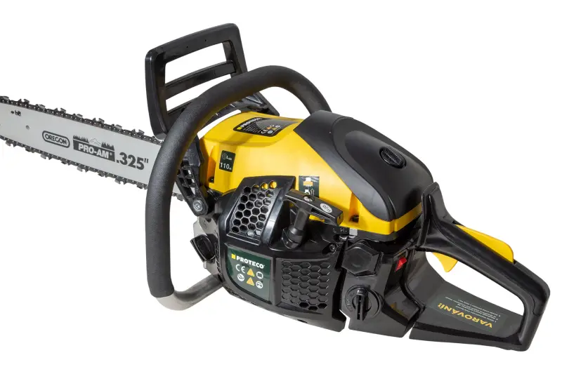 Řetězová pila benzínová Proteco je ideální pomocník pro řezání dřeva na zahradě, přípravu dříví do krbu, odvětvování, prořezávání, řezání palivového dříví apod. Zdařilá kombinace vysokootáčkového dvoutaktního motoru o zdvihovém objemu 50,8 cm ³ a výkonu 2,1 kW činí z motorové pily velmi oblíbeného komfortního a kompaktního pomocníka pro každého vášnivého kutila, či zahrádkáře. Motorová pila disponuje 45 cm lištou s 72článkovým řetězem Oregon pro plnění i těch náročnějších úkolů. Motor je sestavou silentbloků a plastových krytů nejen chráněn proti nárazu, ale i spolu s odstředivou spojkou maximální možnou měrou zbaven vibrací a hlučnosti. Optimální napnutí pilového řetězu lze snadno seřídit pomocí šroubu na boční straně motorové pily.