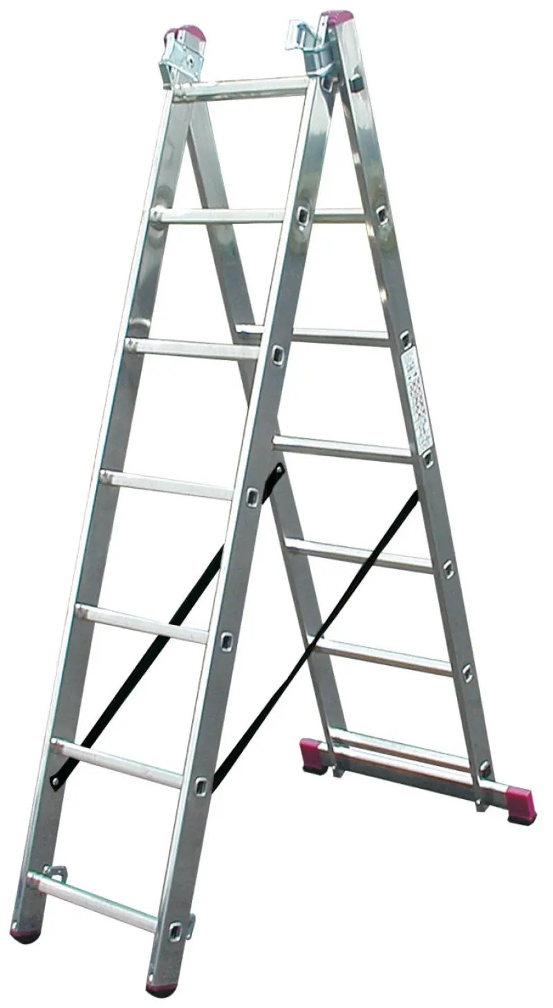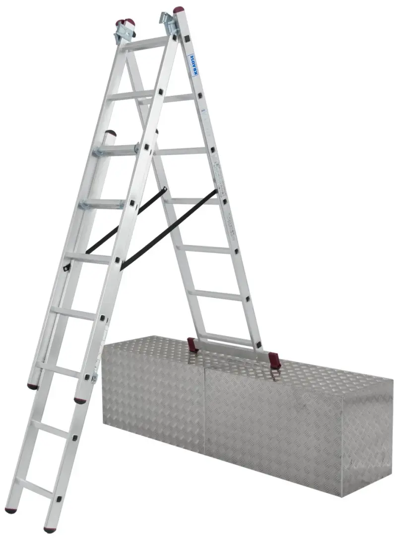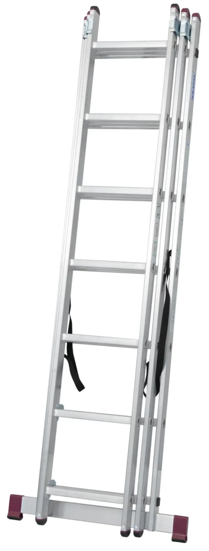 Trojdílný mnohoúčelový hliníkový žebřík, který lze díky unikátní konstrukci kromě běžného použití (opěrný žebřík, štafle a výsuvný žebřík) využít i na schodištích či jiných víceúrovňových površích.