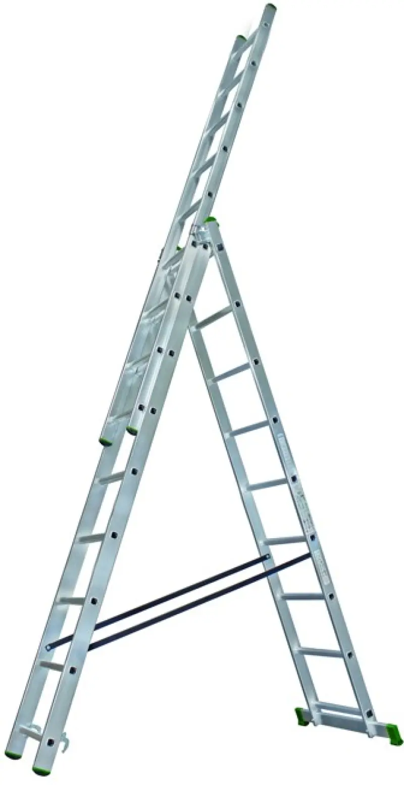 Trojdílný mnohoúčelový hliníkový žebřík je možné použití jako opěrný žebřík, štafle nebo výsuvný žebřík.