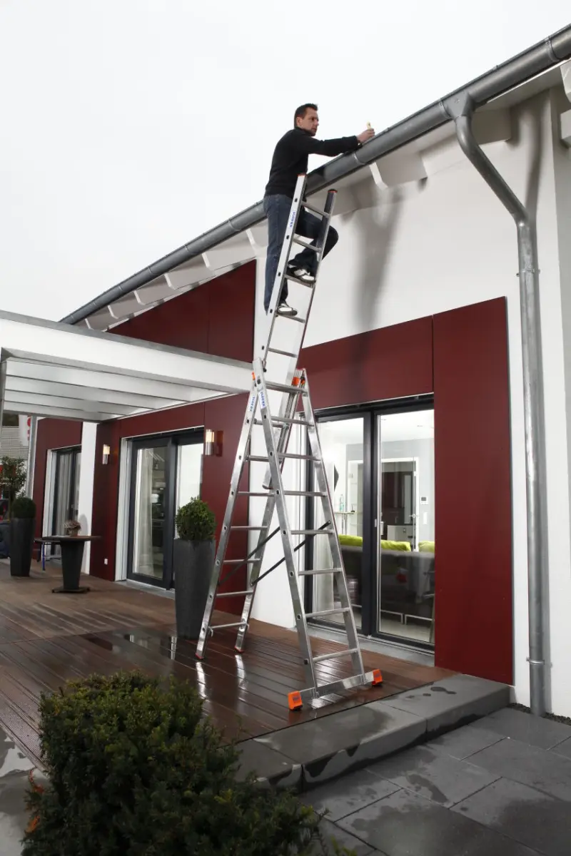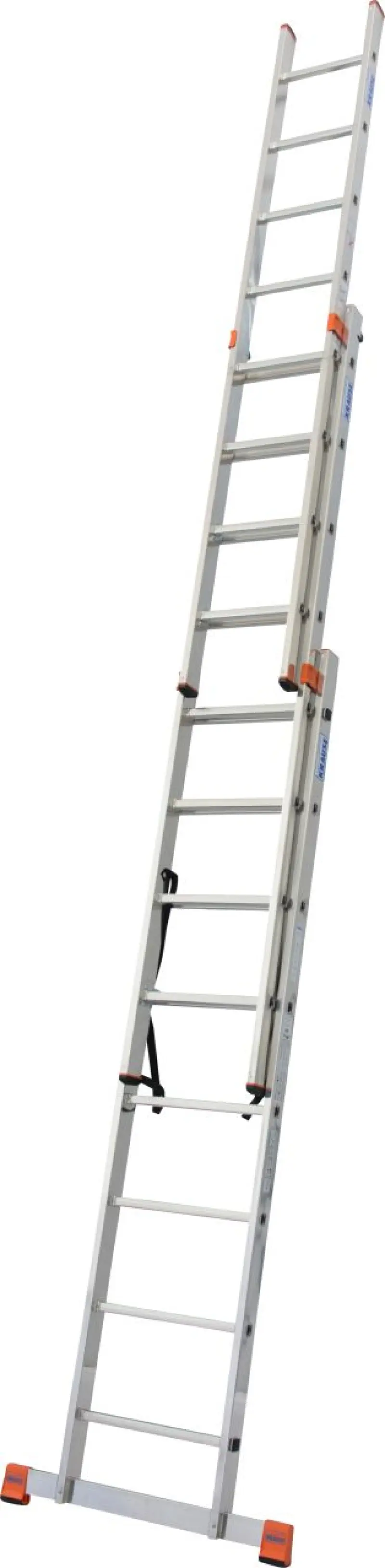 Trojdílný aluminiový mnohoúčelový žebřík, použitelný jako opěrný, výsuvný a samostatný žebřík s výsuvnou částí.